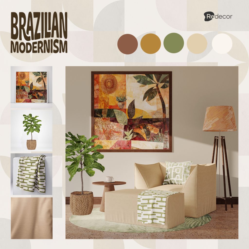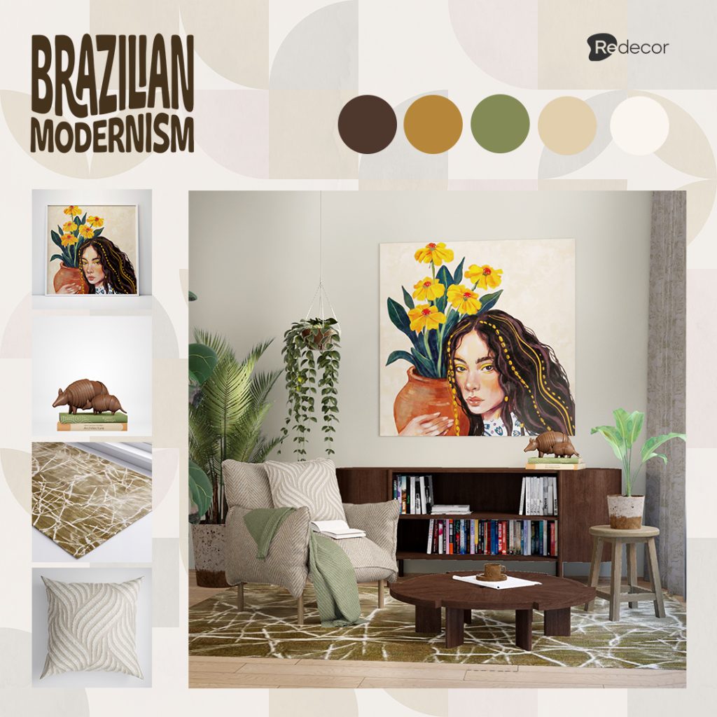 Brazilian design loves curves. Instead of rigid, boxy furniture, look for pieces with rounded edges, flowing lines, and strong silhouettes. In the example created by Redecor’s Art Team below, the curved artwork immediately sets the tone. The sideboard between the artwork and the circular side table introduces a strong horizontal line that anchors and balances the composition.